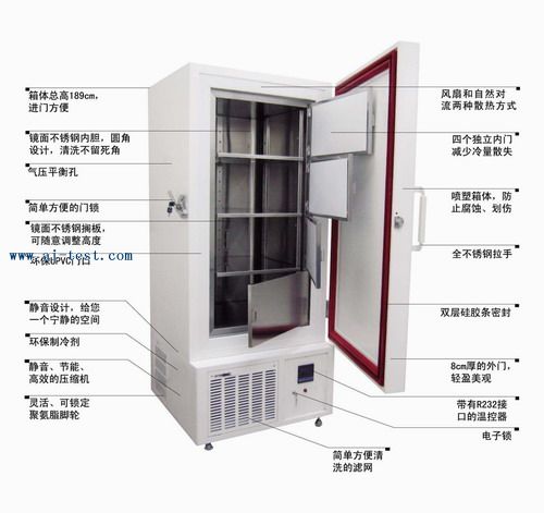 超低溫冰箱采用德國復(fù)疊式超低溫制冷壓縮機(jī)組、國際知名品牌零部件生產(chǎn),性能穩(wěn)定,運行可靠。不銹鋼內(nèi)膽、雙層保