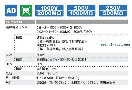測試電壓 250 V DC 500 V DC 1000 V… | 洽詢 | 3160 |