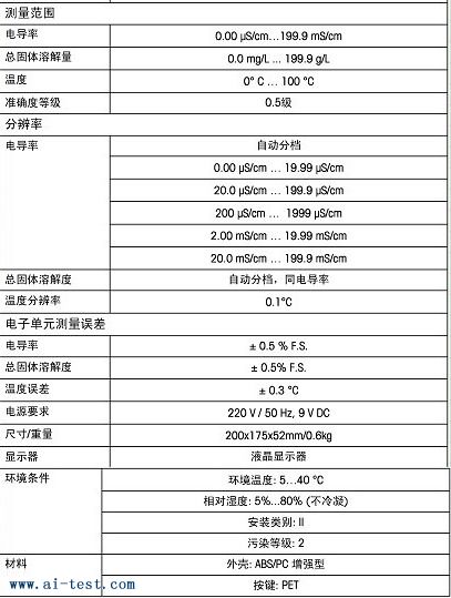顯示器:LCD;TDS范圍:0.00 mg/L -199.9 g/L;電導(dǎo)率精度:+/- 0.5%;電導(dǎo)率范圍:0.00 μS/cm-199.9 mS/cm;溫度精度°C:± 0.3;溫度范圍 °C:0.0 到 100.0;溫度分辨率 °C:0.1;電源:外接電源;操作環(huán)境:5-40 °C; 5-80 %相對濕度;標(biāo)準(zhǔn)配置:含電導(dǎo)率儀主機(jī),電極支架等,不含電極和標(biāo)準(zhǔn)液(可選配各種InLab電導(dǎo)電極);品牌:瑞士METTLER TOLEDO |