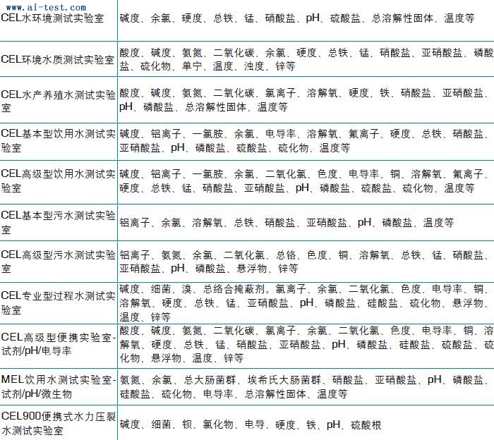 | AL338005 | CEL基本型飲用水測試實驗室;堿度、鋁離子、一氯胺、余氯、電導(dǎo)率、溶解氧、氟離子、硬度、總鐵、硝酸鹽、亞硝酸鹽、pH、磷酸鹽、硫酸鹽、硫化物、溫度等:美國HACH | 1 | 洽詢 | 洽詢 | 備注 | |