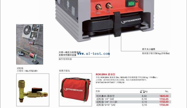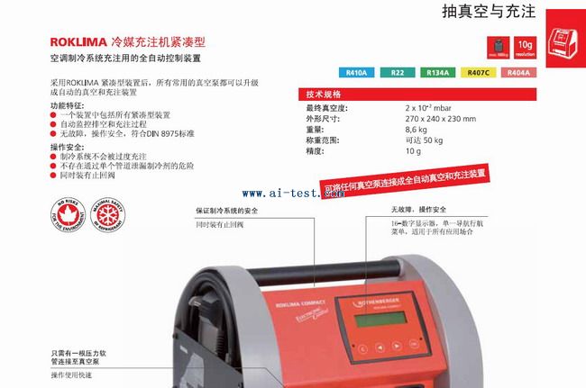 ROKLIMA冷媒充注機緊湊型:最終真空度:2*0.01mbar;外形尺寸:270*240*230mm;重量:8.6kg;稱重范圍:可達50kg;精度:10g;品牌:德國ROTHENBERGER |