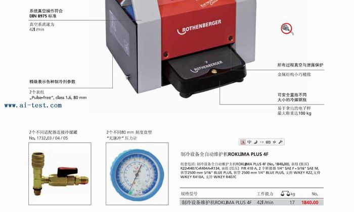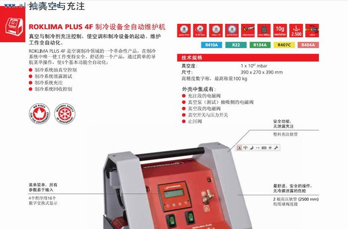 制冷設(shè)備全自動(dòng)維護(hù)機(jī) :真空度:1*0.01;尺寸:390*270*390mm;高精度數(shù)字稱(chēng):最高稱(chēng)100kg;工作能力:42L/min;重量:17kg;品牌:德國(guó)ROTHENBERGER