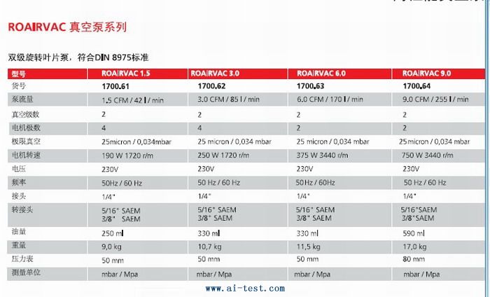 | AM514764 | 高性能真空泵:雙級旋轉(zhuǎn)葉片泵;符合DIN8975標準;泵流量:1.5CFM/42L/min;電機極數(shù):4;電機轉(zhuǎn)速:190W1720r/m;油量:250ml;重量:9kg;品牌:德國ROTHENBERGER | 1臺 | 洽詢 | 洽詢 | 備注 |