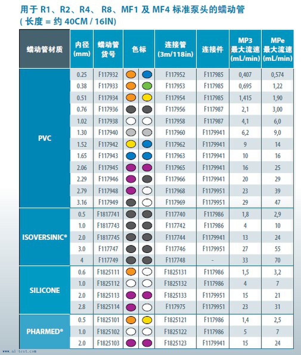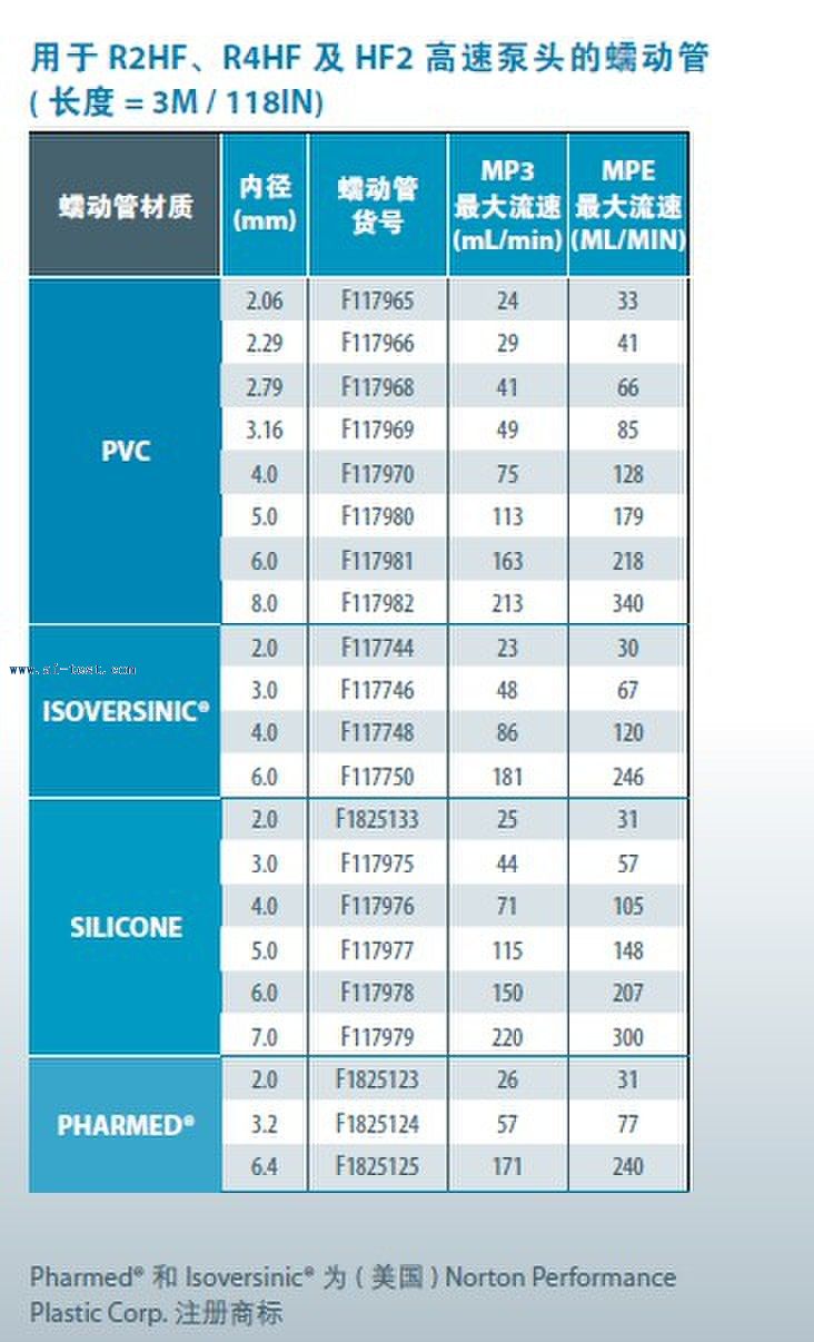 1.PVC,一般通用,2.硅樹(shù)脂,化學(xué)兼容性強(qiáng),多用于生物制品,3..Pharmed® 符合USP & fDA 4 級(jí)標(biāo)準(zhǔn),多用于藥物和食物方面4.Isoversinic® 可用于化學(xué)腐蝕液體。• 根據(jù)最高的流速要求。