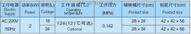 A101132 手提式不銹鋼壓力蒸汽滅菌器(普通型、防干燒型):容積:24L;儲(chǔ)物桶尺寸cm:28×34;包裝尺寸cm:42×42×66;其他參數(shù)與A101131一樣;品牌:中國 1 2625 洽詢 備注