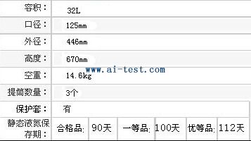| A130299 | 液氮罐:容積:32L;口徑:125mm;外徑:446mm;高度:670mm;空重:14.6kg;提筒數(shù)量:3個;保護(hù)套:有;靜態(tài)液氮保存期:合格品:90天,一等品:100天;優(yōu)等品:112天;品牌:中國 | 1 | 5700 | 洽詢 | 備注 | |