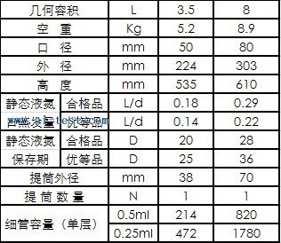航空運(yùn)輸型液氮罐:幾個(gè)容積L:3.5;空重kg:5.2;口徑mm:50;外徑mm:224;高度mm:535 ;靜態(tài)液氮日蒸發(fā)量l/d:0.14;靜態(tài)液氮保存期d:25;提筒外徑mm:38;提筒數(shù)量:1;細(xì)管容量(單層)0.50 ml和0.25ml:214和472;品牌:中國(guó) |