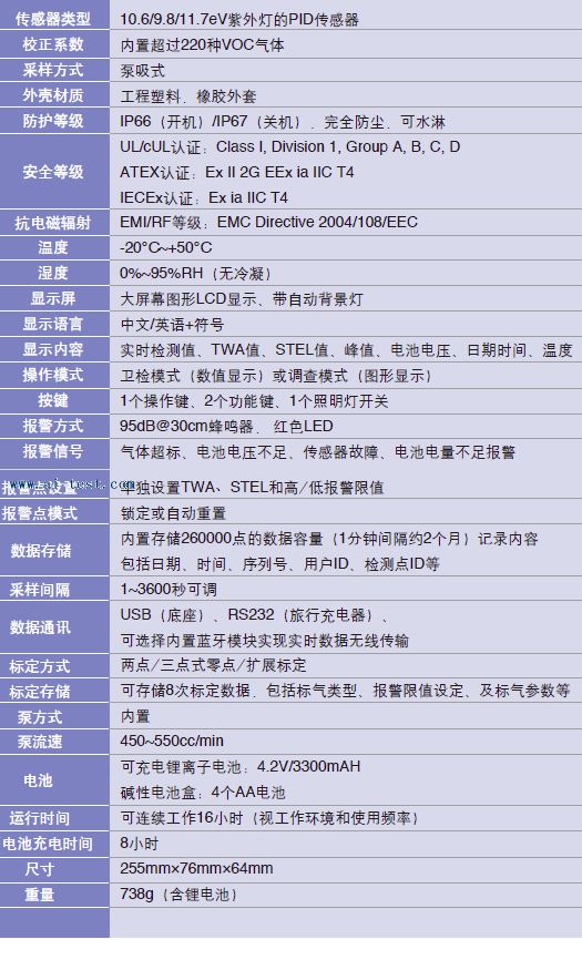 | AL830185 | VOC檢測儀:;是一款當(dāng)今市場上最靈敏的廣譜手持式揮發(fā)性有機(jī)化合物(VOC)氣體檢測儀,采用RAE最新的第三代光離子化檢測器(PID),提高了檢測精度和響應(yīng)時間,檢測范圍達(dá)到1ppb-10000ppm顯示內(nèi)容: 實時檢測值、TWA值、STEL值、峰值、電池電壓、日期時間、溫度 ;數(shù)據(jù)存儲: 內(nèi)置存儲260000點的數(shù)據(jù)容量(1分鐘間隔約2個月)記錄內(nèi)容包括日期、時間、序列號、用戶ID、檢測點ID等;采樣間隔: 1-3600秒可調(diào);采樣泵流速: 450cc/min~550cc/min;品牌:美國RAE | 1 | 95000 | 洽詢 | 備注 |