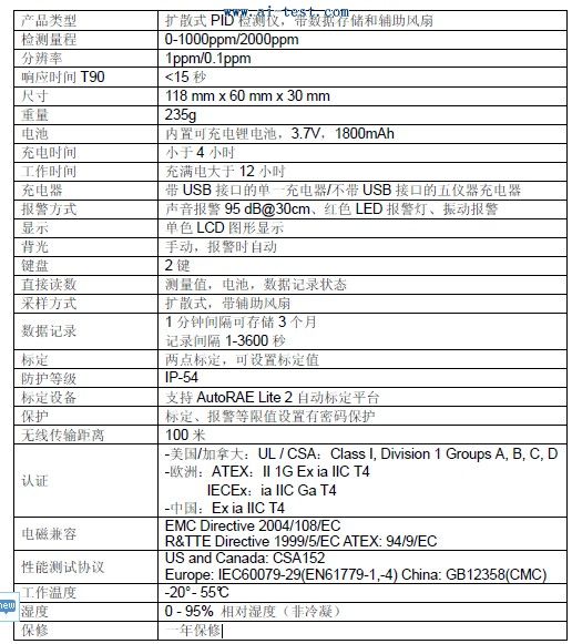 | AL830287 | 有機(jī)氣體檢測儀:;產(chǎn)品類型擴(kuò)散式PID 檢測儀,帶數(shù)據(jù)存儲(chǔ)和輔助風(fēng)扇;檢測量程0-1000ppm/2000ppm;分辨率1ppm/0.1ppm;響應(yīng)時(shí)間T90 <15 秒;尺寸118 mm x 60 mm x 30 mm 重量235g;電池內(nèi)置可充電鋰電池,3.7V,1800mAh;充電時(shí)間小于4 小時(shí);工作時(shí)間充滿電大于12 小時(shí);充電器帶 USB 接口的單一充電器/不帶USB 接口的五儀器充電器;報(bào)警方式聲音報(bào)警95 dB@30cm、紅色LED 報(bào)警燈、振動(dòng)報(bào)警;顯示單色LCD 圖形顯示;背光手動(dòng),報(bào)警時(shí)自動(dòng);鍵盤 2 鍵;直接讀數(shù)測量值,電池,數(shù)據(jù)記錄狀態(tài);采樣方式擴(kuò)散式,帶輔助風(fēng)扇;數(shù)據(jù)記錄;1 分鐘間隔可存儲(chǔ)3 個(gè)月;記錄間隔1-3600 秒;標(biāo)定兩點(diǎn)標(biāo)定,可設(shè)置標(biāo)定值;防護(hù)等級(jí)IP-54;標(biāo)定設(shè)備支持AutoRAE Lite 2 自動(dòng)標(biāo)定平臺(tái);保護(hù)標(biāo)定、報(bào)警等限值設(shè)置有密碼保護(hù);無線傳輸距離 100 米;認(rèn)證;-美國/加拿大:UL / CSA:Class I, Division 1 Groups A, B, C, D;-歐洲:ATEX:II 1G Ex ia IIC T4;IECEx:ia IIC Ga T4;-中國:Ex ia IIC T4;電磁兼容;EMC Directive 2004/108/EC;R&TTE Directive 1999/5/EC ATEX: 94/9/EC性能測試協(xié)議;US and Canada: CSA152;Europe: IEC60079-29(EN61779-1,-4) China: GB12358(CMC);工作溫度-20° - 55°C;濕度 0 - 95% 相對濕度(非冷凝);保修一年保修;品牌:美國RAE | 1 | 23750 | 洽詢 | 備注 |