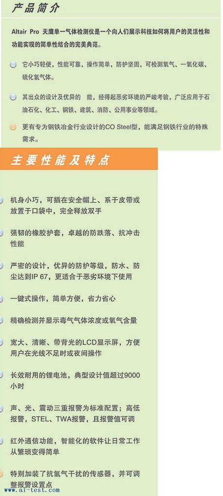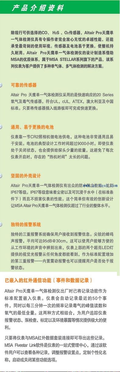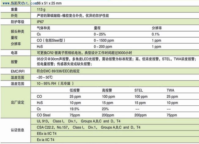 | 800005 | MSA 袖珍式單種氣體檢測儀(氧氣);外形尺寸:86*51*25mm;重量:113g;外殼:嚴密的聚碳酸酯-橡膠復(fù)合外殼,優(yōu)異的防護性能;防護等級:IP67;O2量程:0~25%;分辨率:0.1%;電源:可更換CR2鋰離子照相機電池,典型設(shè)計工作時間超過9000小時;報警:95分貝@30cm聲報警,多角度LED光報警,震動報警為標準配置;高、低濃度報警,STEL,TWA濃度報警;低電量報警;傳感器失效或缺失報警;EMC/RFI:符合EMC 89/336/EEC的規(guī)定;溫度范圍:-20~50℃;濕度范圍:10~95%RH(無冷凝);出廠設(shè)定O2:低報警:19.5%;高報警:23%;認證信息:UL 913,Class I,Div.1,Groups A,B,C and D,T4;CSA C22.2,No.157,Class I,Div.1,Groups A,B,C and D,T4;EEx ia IIC T4;Ex ia IIC T4;品牌:美國 MSA | 1 | 4330 | 洽詢 | 備注 | |