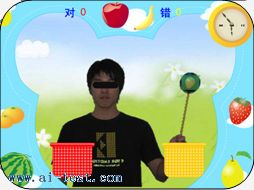 接水果:魔幻游戲中,小朋友自己手捧可愛的小果籃,接住掉下的鮮亮可愛的水果,并按不同顏色放進(jìn)大的籃筐中。